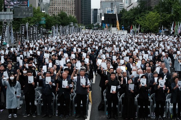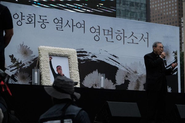 야당 대표들에 이어 추모사에 나선 함세웅 신부는 “양회동 열사는 야 6당 대표에게 하나로 뜻을 모아 윤석열 독재와 싸워야 한다고 호소했다”라고 일깨우면서, “불의한 윤 정권을 끌어내리겠다”라고 기도했다.