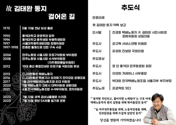 ‘노동해방과 진보집권을 위해 모든 것을 바친 혁명가’ 택배노동자 故 김태완 노동사회장
