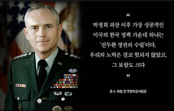 훗날 전두환이 ‘체육관 선거’로 11대 대통령에 당선된 날, 존 위컴 당시 주한미군 사령관은 AP통신과의 인터뷰에서 다음과 같이 말했다.