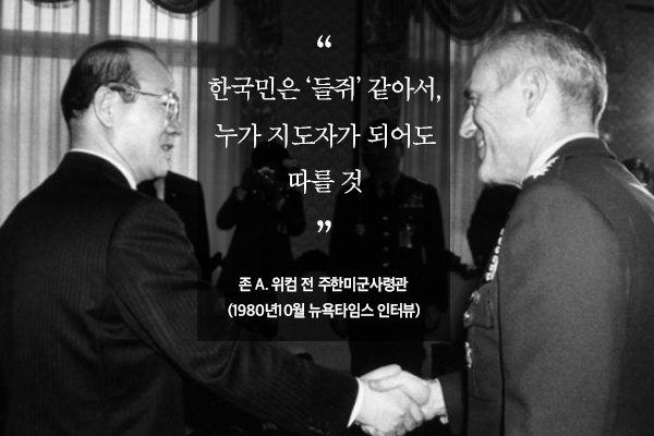 미 군부의 이런 인식이 반영돼서일까, 위컴 사령관은 “한국인은 ‘들쥐’ 같아서, 누가 지도자가 되어도 따를 것”(1980년10월, 뉴욕타임즈 인터뷰)이라고 말한 바 있다.