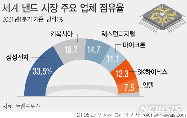 메모리 반도체는 D램과 낸드플래시로 나눌 수 있는데, 현재 시장 규모가 비슷하지만 2025년 이후에는 낸드플래시 시장이 D램 시장을 넘어설 것으로 예상된다. 시스템반도체와 달리 메모리 반도체는 동일한 제품을 누가 더 많이 더 싸게 만드느냐가 관건인 규모의 산업이다. D램 시장에 비해 낸드플래시 시장은 1위 삼성전자를 제외하고 2위권을 두고 SK하이닉스, 일본 키옥시아, 미국 WD(웨스턴디지털)과 마이크론이 쟁투를 벌이는 형국이다. 이에 WD와 키옥시아가 합병을 통해 경쟁력을 키우려는 시도를 계속해 왔는데, 이 합병이 성사되면, SK하이닉스가 3,4위로 밀려나는 것은 물론이고, 1위인 삼성전자조차도 위협받는 커다란 지각변동이 예상된다.