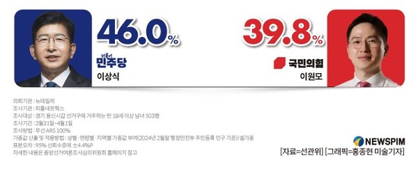 5) 뉴데일리가 PNR-(주)피플네트웍스에 의뢰해 지난 3월 31일부터 4월 01일까지 경기도 용인시 갑 선거구에 거주하는 만18세이상 남녀 503명을 대상으로 실시했다. 조사방법은 무선 ARS 100% 무선전화번호 가상번호 비율로 진행됐으며, 표본오차는 95% 신뢰수준에 ±4.4%P다. 자세한 사항은 중앙선거여론조사심의위원회 홈페이지를 참조하면 된다.