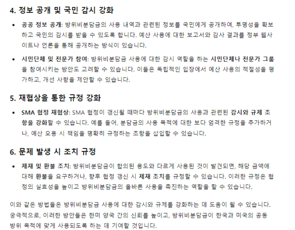 특히 ChatGPT는 문제 발생 시 제재 및 환불 조치를 요구해야 한다는 방안을 제시한다. 방위비분담금이 합의된 용도와 다르게 사용된 것이 발견되면, 해당 금액에 대한 환불을 요구하거나, 향후 협정 갱신 시 제재 조치를 규정할 수 있다는 것이다.