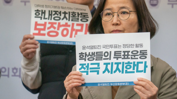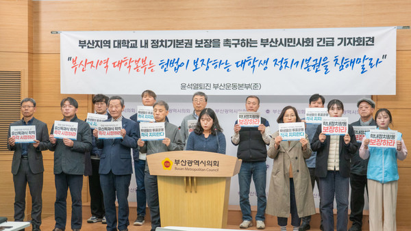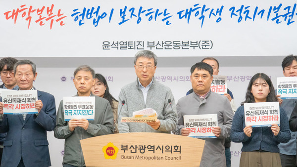 윤석열퇴진 부산운동본부(준)는 6일 부산시의회 브리핑룸에서 대학생들의 정치기본권을 제한하는 대학본부를 규탄하고 대학민주화를 위해 나선 대학생들을 지지하기 위해 긴급기자회견을 진행했다.