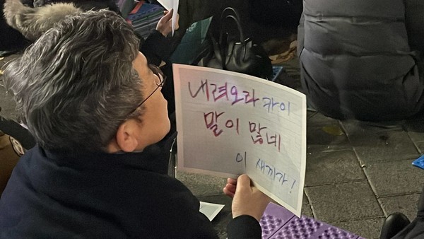 금정구 집회에 참가한 박모씨는 “주변 사람들이 모두 윤석열을 욕한다”며 “한 친구는 결국 절에 가서 소원까지 빌었어요. ‘세계평화, 전쟁종식… 윤석열 퇴진!’”이라며 웃음을 터뜨렸다.