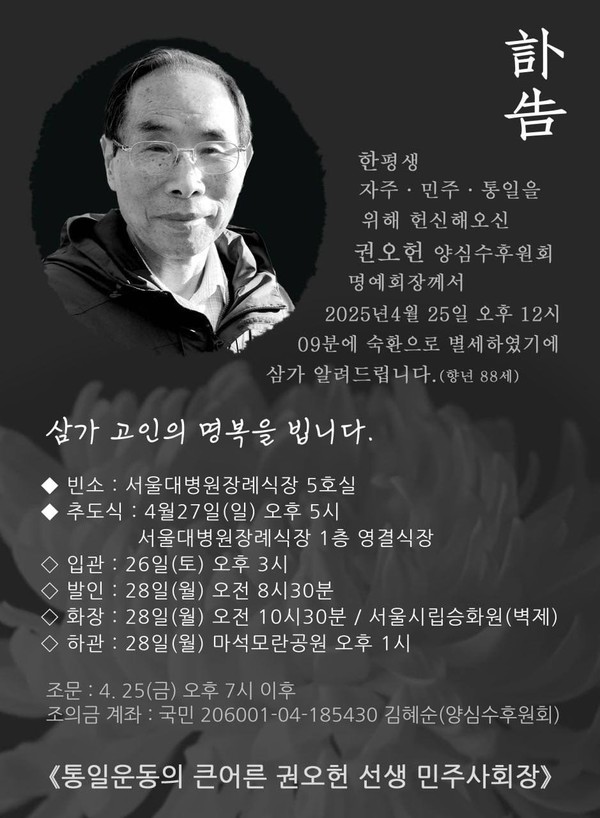 자주, 민주, 통일의 길에 평생 헌신한 양심수후원회 권오헌 명예회장이 4월 25일 낮 12시 9분 별세했다.