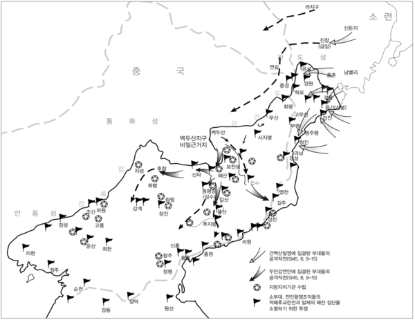 총공격은 다음 세 축으로 전개되었다. 첫째, 조선인민혁명군 주력부대의 국경 돌파 작전. 둘째, 국내 소부대와 인민무장대의 배후타격. 셋째, 전민항쟁을 통한 해방지대의 구축이었다. 이 세 가지는 각각 독립된 전투방식이자, 유기적으로 결합된 전략이기도 했다.
