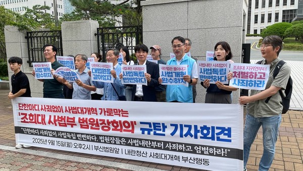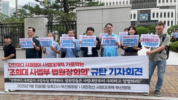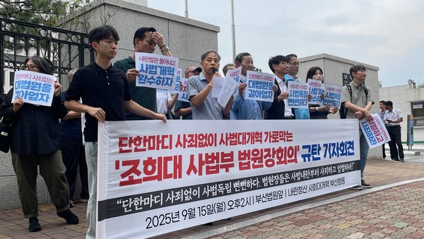 15일(월) 오후2시 부산지방법원 앞, 내란청산 사회대개혁 부산행동이 '전국 법원장회의'결과를 규탄하는 긴급기자회견을 진행했다. 본 회견에는 민주사회를 위한 변호사모임 부산지부(이하 부산민변), 부산참여연대, 민주누리회 등을 비롯한 시민단체와 조국혁신당, 진보당 등이 참가했다.
