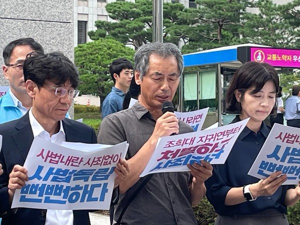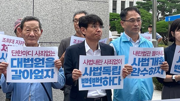 참석자들은 "단한마디 사죄없는 대법원을 갈아엎자", "양심있는 판사라면 사법개혁 저항말라", "조희대 지귀연부터 처벌하고 사죄하라"등의 구호를 외치며 기자회견을 마무리 했다.