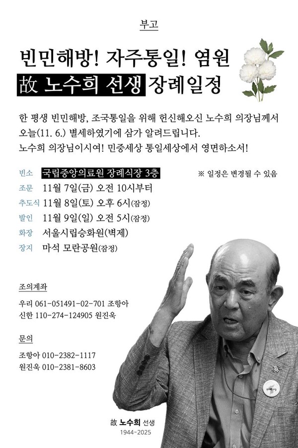 6일 오전 7시 51분, 노수희 전 조국통일범민족연합 남측본부 부의장이 급성심장마비로 별세했다. 전날 비전향장기수 고 박순자 선생 빈소를 찾은 뒤 몸 상태가 나빠 숙소에서 휴식 중이었고, 다음 날 아침 끝내 일어나지 못했다.