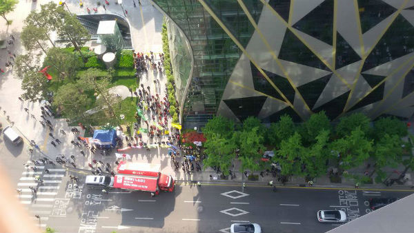In the morning when we wake up, we see there is the stage for the ceremony by the Federation of Korea Trade Unions down in Seoul Plaza. [There are two Unions in South Korea: the other is the Korean Confederation of Trade Unions.] In a while, we hear, “Choi, Jung Myung and Han, Gyu Hyup, Stay strong!” through an amplifier. We look down to the street, and we see Samsung Electronics Service division comrades waving their arms up toward us. Thank you all who empowered us in front of the tent today.