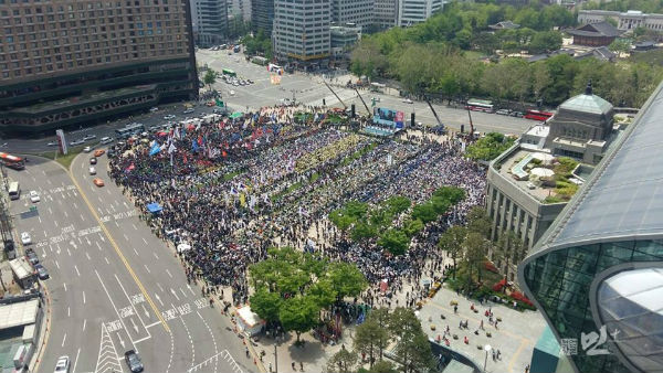 We see, on the screen down on the stage in the Plaza, the Labor Day ceremonies being held nationwide, here and there, lots of union members participating, We feel a bit disappointed not able to see the Confederation Trade Unions ceremony in Seoul, but we do hope, as of today, through more powerful fights and all, may the Confederation Trade Unions chairman Han, Sang Gyun (who is now in prison) be released, and may be the hope of the people who have been forced to the edge of this deep cliff.