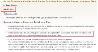 그런데 이 보고서는 북미정상회담이 열리기 전인 5월25일자 보고서였다. 정보를 분석하는 시간, 보고서를 작성하는 시간 등을 감안하면 이 보고서에 적힌 ‘강성발전소’의 ‘의심스러운 활동’은 아무리 짧게 잡아도 한 달 전의 정보를 토대로 했을 것이다. 보고서가 5월25일 발표되었으니 ‘강성발전소에서의 의심스러운 우라늄 농축 활동’은 적어도 4월로 거슬러 올라간다는 것을 의미한다. 따라서 이 보고서가 100% 사실에 기반한 것이라고 할지라도 이 보고서에 적힌 정보는 아무리 늦어도 4월 중하순의 것이다.