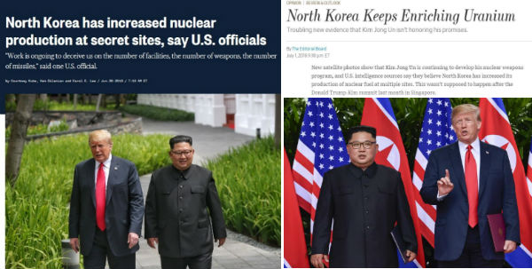 이같은 보도와 함께 6월12일 북미정상회담 사진을 게시한 것은 분명한 의도를 갖는다. 즉 트럼프 대통령이 김정은 위원장에게 속고 있다는 인상을 독자들에게 심어주려는 것이다. 물론 이들 기사가 근거 없는 것은 아니다. 다만 그 근거가 터무니없다는 것에 있다.