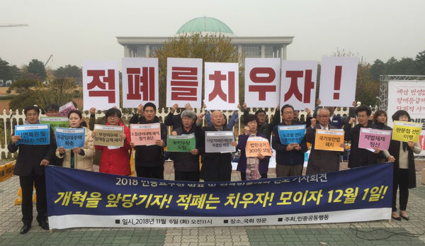 그러면서 박 상임대표는 “적폐의 온상인 국회에서 적폐청산과 사회대개혁에 사사건건 대립하던 여야가, 민주노총을 물어뜯고 민중을 짓밟는 데는 공조하고 있는 상황에서, 민중의 뜻을 천명하기 위해 촛불혁명에 앞장섰던 민중들이 다시 한 번 신발 끈을 동여매고 12월1일 국회 앞에서 민중대회를 연다”고 발표했다.