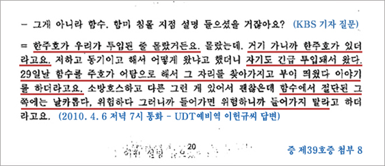 * 천안함 함수는 해저에 90도 우현쪽으로 완전히 누워있었음(접근가능한 곳은 좌현 뿐임)
