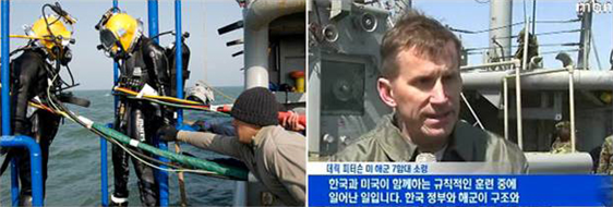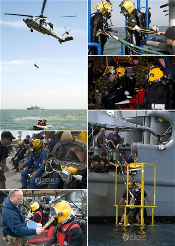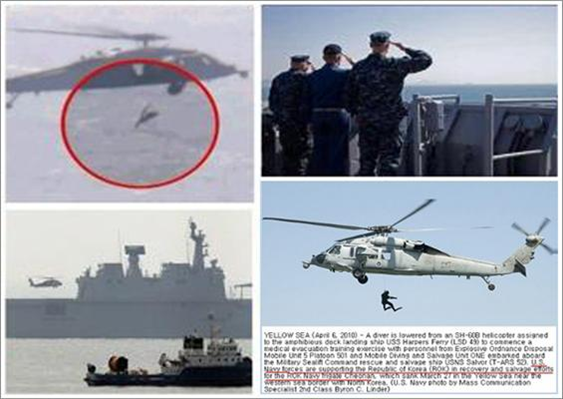 미군 헬기가 미상의 물체를 끌어올려 독도함이 아닌 남측으로 이동했다며 보도된 사진(KBS뉴스 화면 캡처), 그리고 바다를 향해 경례로 예를 표하는 미군들과 헬기에 매달린 잠수부 사진(미7함대 홈페이지) 등은 천안함 구조나 수색, 인양과는 전혀 관련이 없는 일이었습니다.