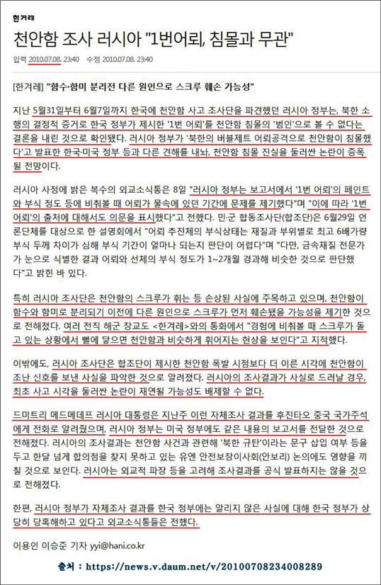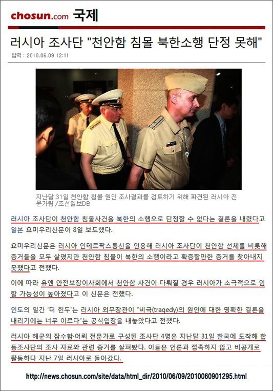 러시아 조사단이 러시아로 귀국하자마자 인타르팍스 통신을 통해 흘러나온 뉴스들은 “천안함 침몰 북한 소행 단정 못 한다”는 내용이었습니다.