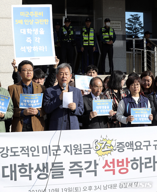 한국진보연대를 포함한 55개의 연명 단체는 지난 19일 오후 남대문경찰서 정문 앞에서 기자회견을 열어 해리스 주한미대사가 지난 14일 동아일보와의 인터뷰를 통해 ‘방위비 분담금 5배 인상요구는 정당하다’, ‘한국이 5분의 1만 감당하고 있는 것이 문제’라는 새빨간 거짓말을 한 것에 대해 “주한미군 주둔경비 대부분을 이미 한국이 짊어지고 있다. 또, ‘미국이 힘으로 한국의 재정주권을 짓밟고 혈세를 강탈해 가겠다’는 협박으로 외교관의 행태는 정상적 외교 행위가 아니라 조폭행동대장과 같다”고 말하며, “대학생들의 의로운 행동은 처벌이 아니라 오히려 혈세강탈을 막고 재정주권을 지키려 한 의로운 행동으로 격려받아야 마땅하다”고 주장했다.
