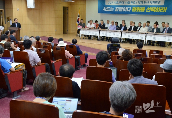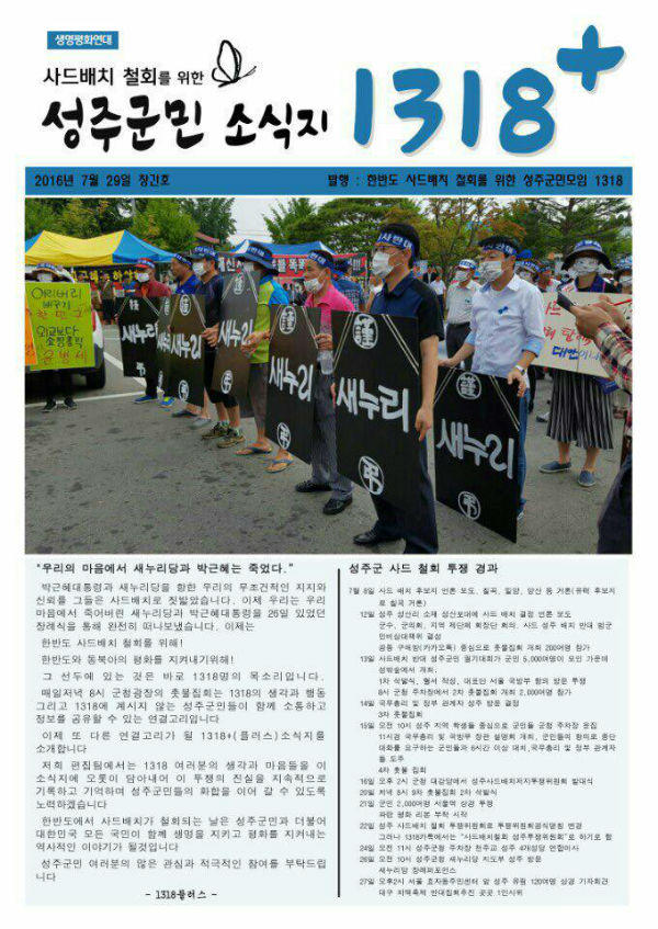 According to reporter Kang Hoseok at MinPlus (“We are Seongju, and Seongju is the Republic of Korea,” July 27, 2016), the gathering and press conference with the declaration was originally planned to involve 1,000 societal elders and leaders, but around 2,600 elders eventually participated in the declaration under the slogan, “The THAAD is Co-Destruction. Choose Peace.”